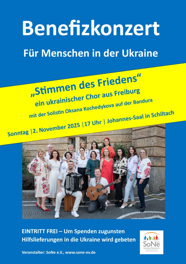 Der ukrainische Chor „Stimmen des Friedens“ aus Freiburg versteht sich als Botschafter für ukrainische Musik. Die Musik schafft es, Menschen universell zu vereinen und Brücken zu bauen. Mit ihren Auftritten möchte der Chor ein Zeichen setzen für Frieden, das Selbstbestimmungsrecht der Völker und demokratische Werte.